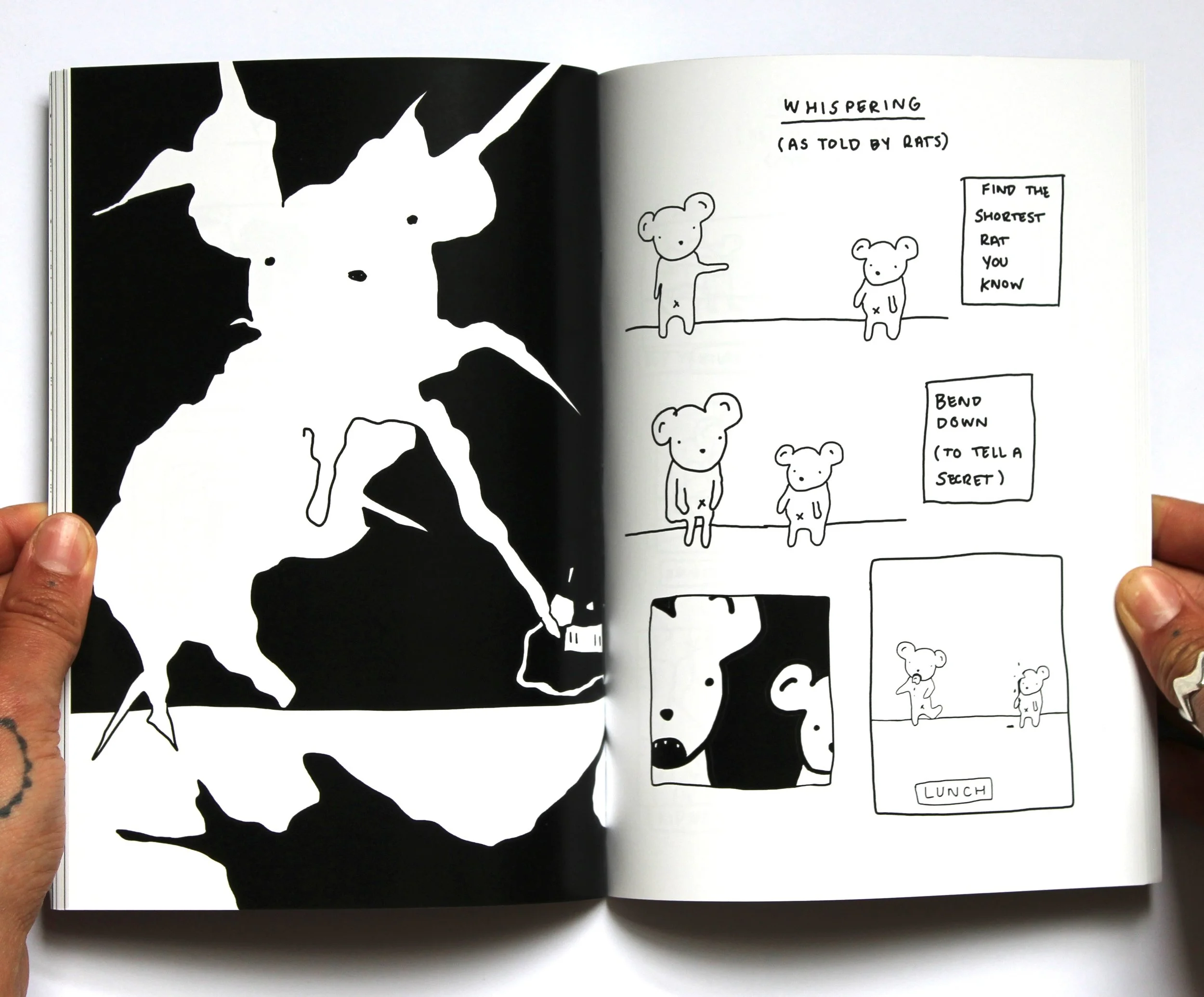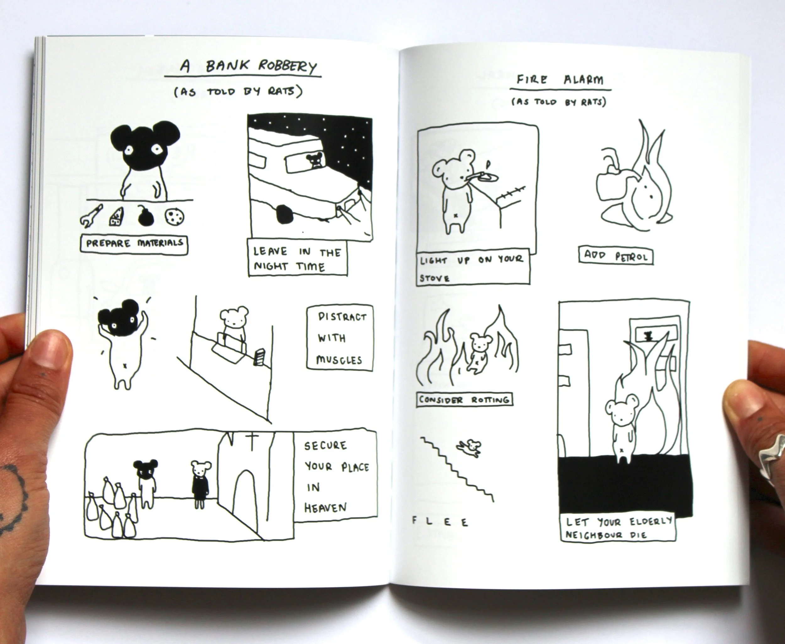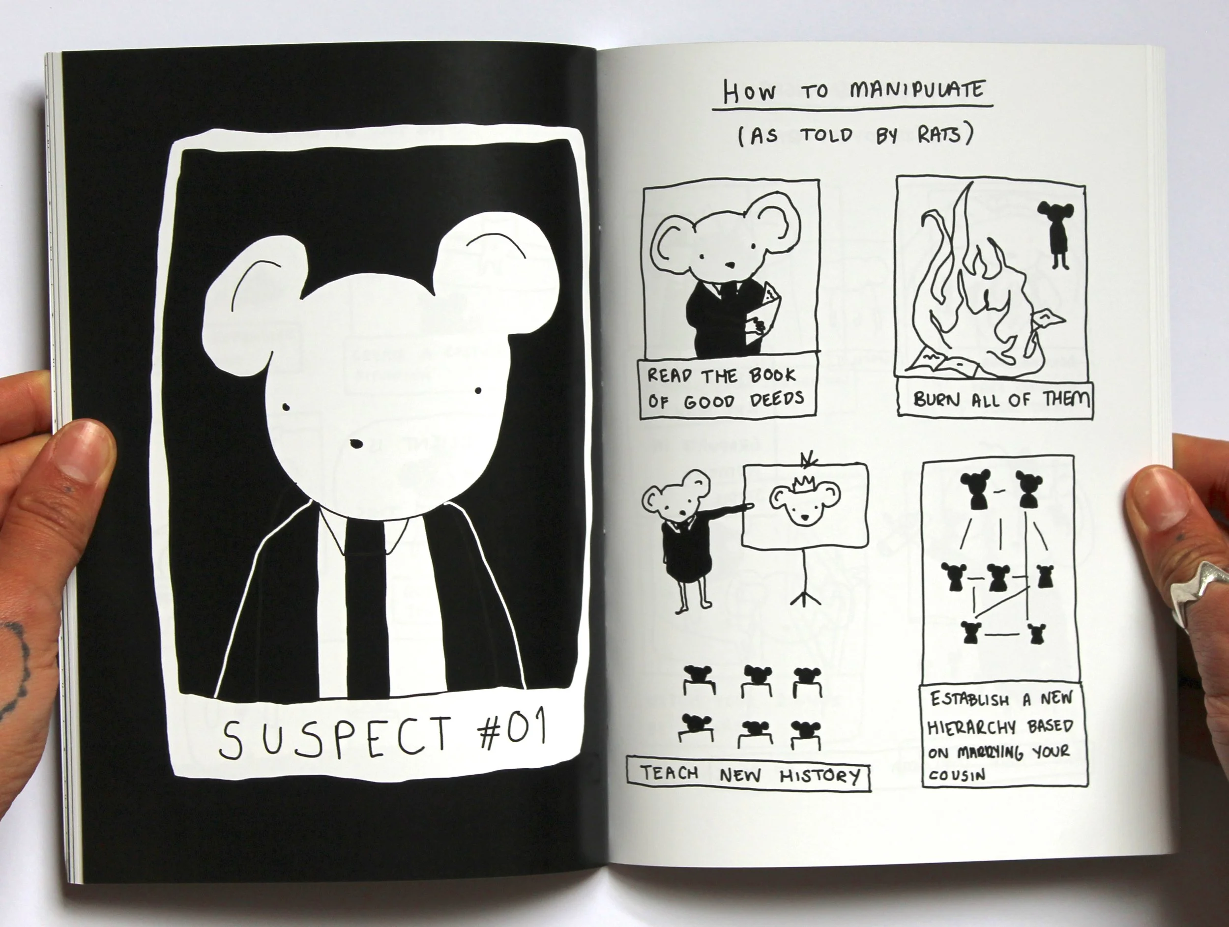 As Told by Rats indulges the biographical stories of the Rat Pack, who are committed to a life of crime. This tongue-in-cheek exploration of behaviour and social issues depicts the worst decision winning… every single time. Topics such as domestication, denial and getting rich-quick are uncovered. Each single-page strip takes us on a new adventure with an unpredictable end.