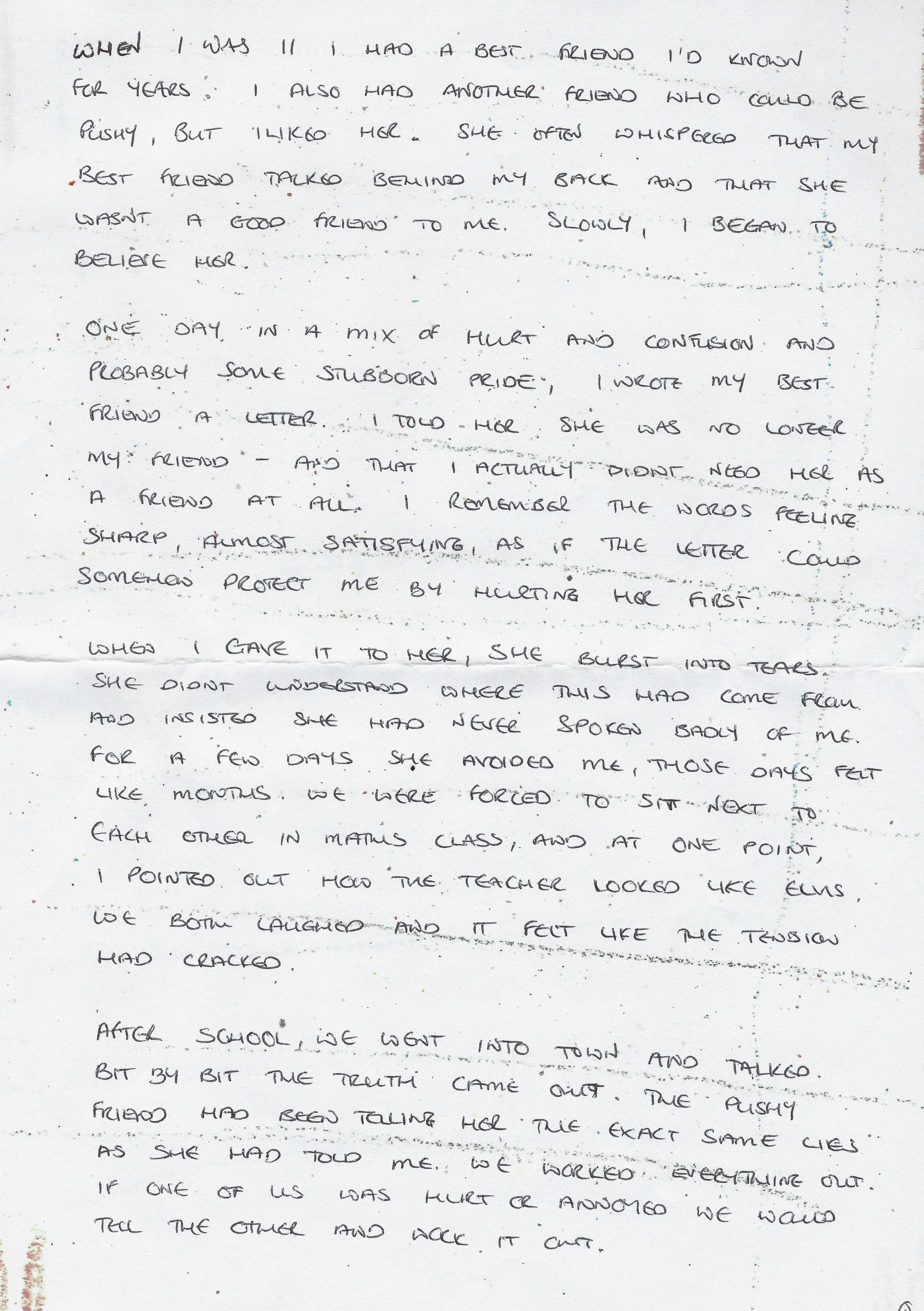“When I was 11 I had a best friend I’d known for years. I also had another friend who could be pushy, but I liked her. She often whispered that my best friend talked behind my back and that she wasn’t a good friend to me. Slowly, I began to believe her.